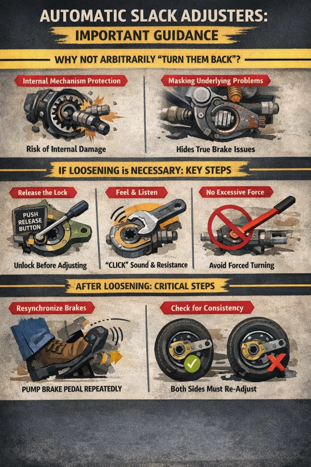 かどうか 自動スラックアジャスター 手動で緩めることができる (一般に「元に戻す」と呼ばれます) ことは、車両のメンテナンスにおいて非常に重要な点です。