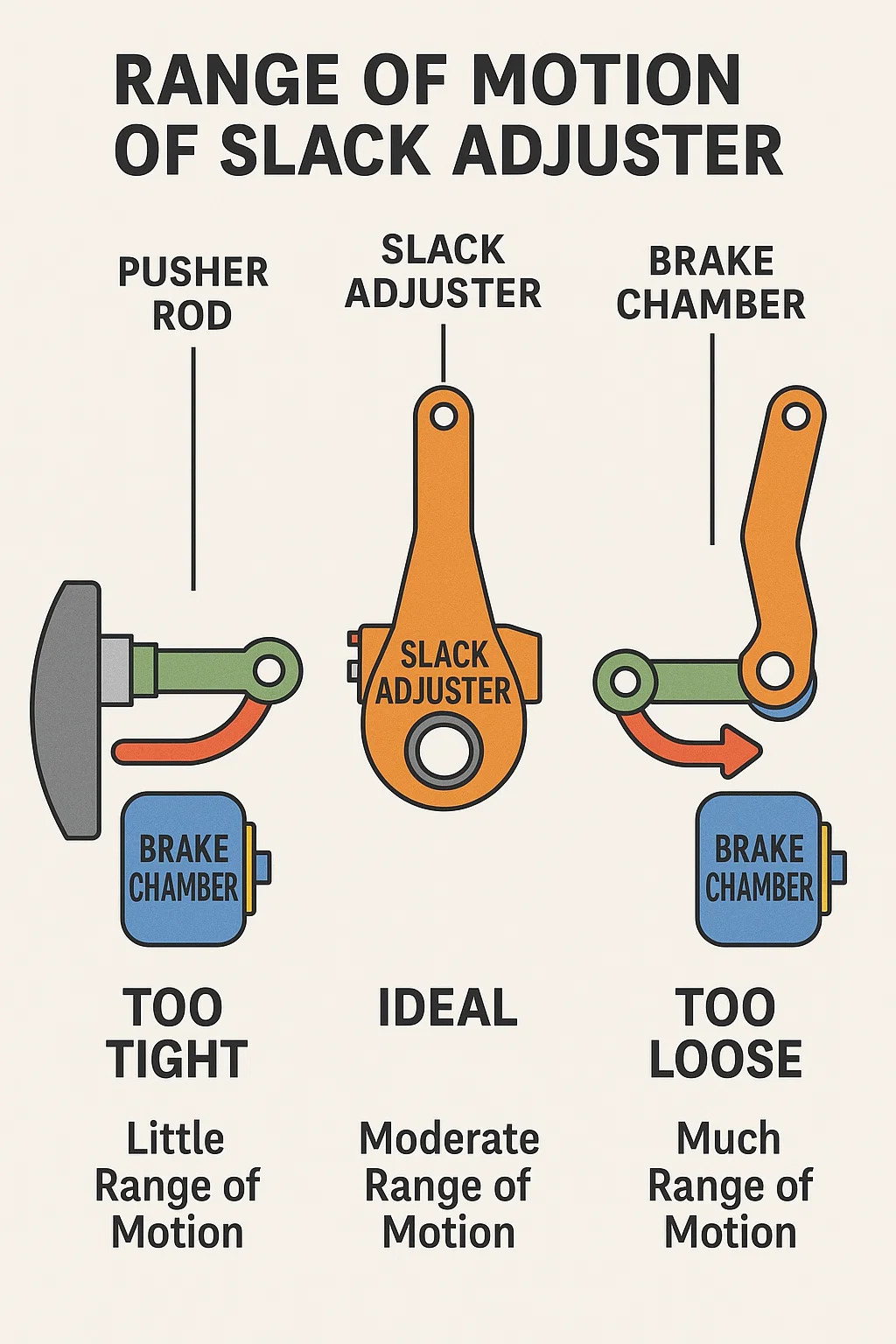「動作範囲」、より専門的にはブレーキストロークは、エアブレーキシステムの作動中にプッシャーロッドを引くときにスラックアジャスターが移動する距離を指します。