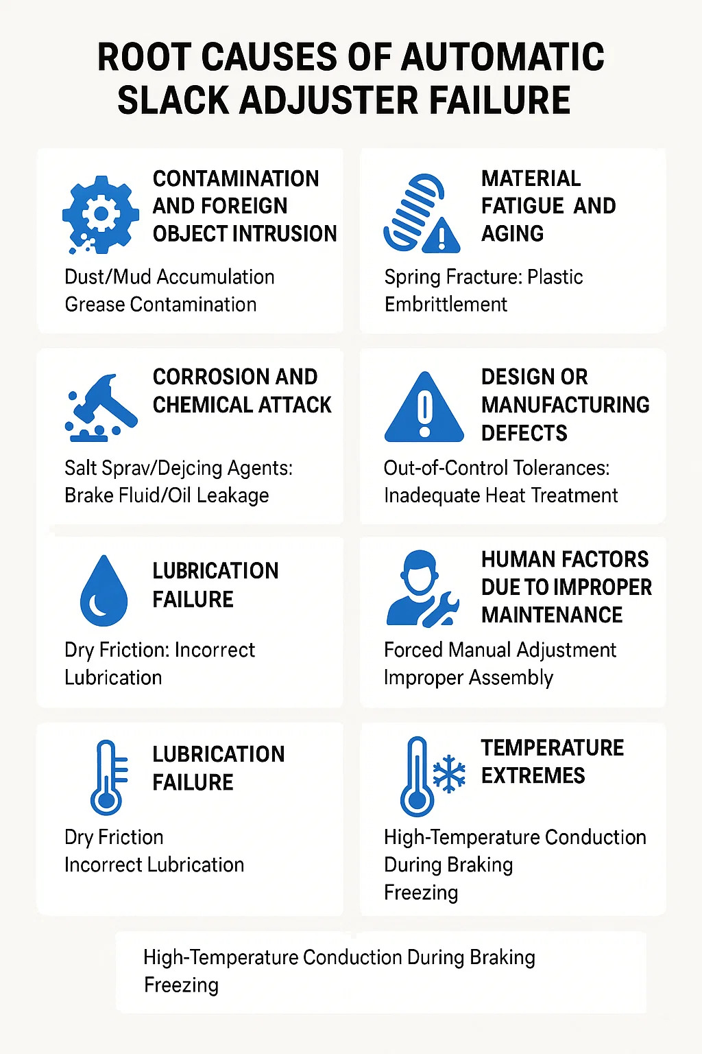 ブレーキ中の高温伝導:山岳地帯での長い下り坂の下り坂では、ブレーキドラムからの熱がアジャスターに伝達され、グリースの炭化またはシールの硬化が引き起こされます。